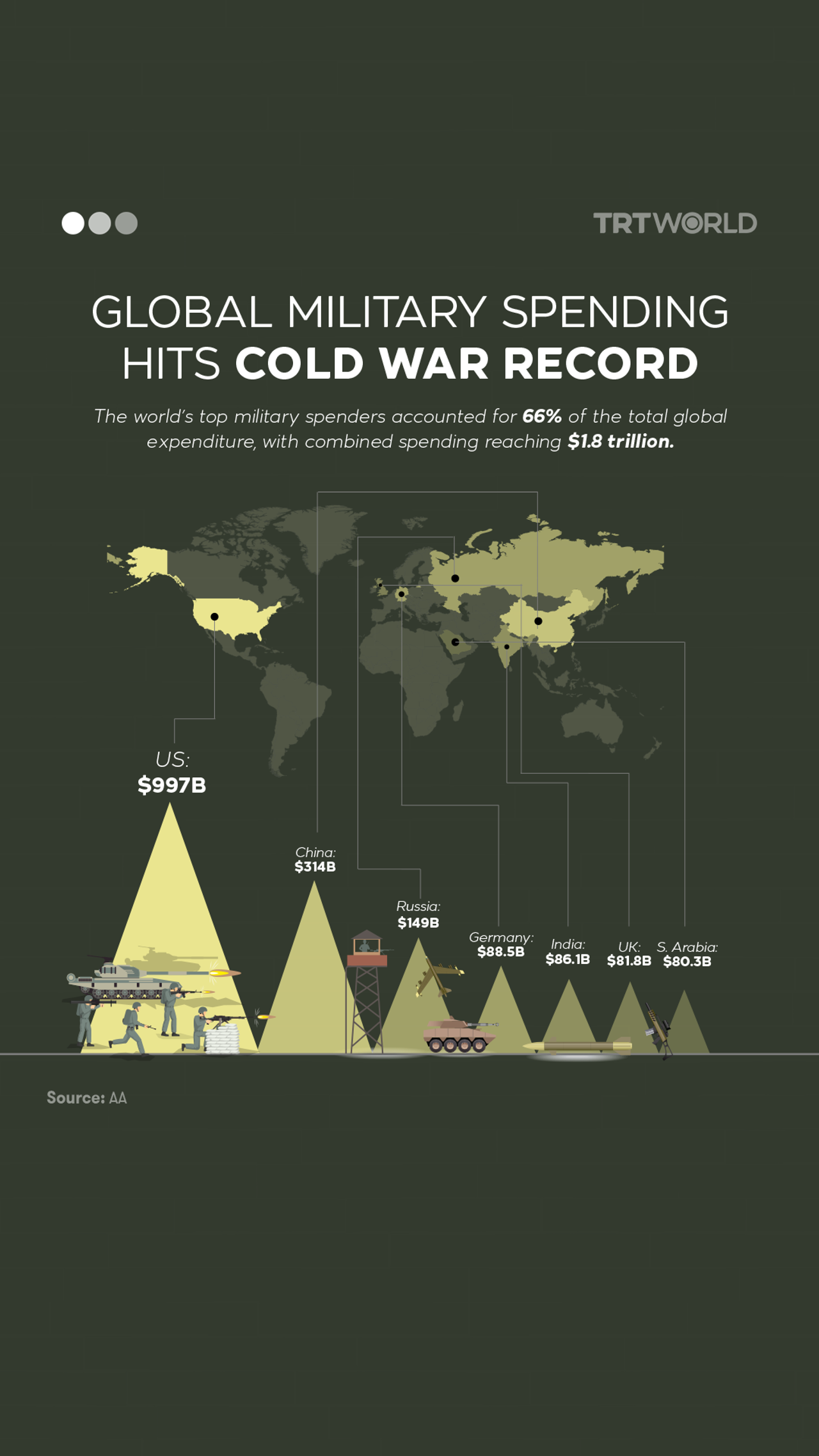 The US, China and Russia remained the top three military spenders, with a combined expenditure of $1.480 trillion, or 51 percent of the global total.